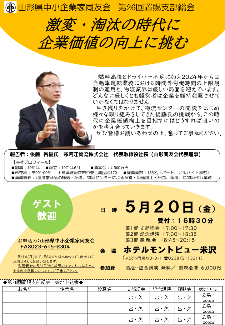 2022.05.06 第26回置賜支部総会 日時 5月20日(金) 受付:16時30分 支部総会 17:00~17:30 記念講演 17:30~18:35 懇談会 18:45~20:15 会 場 ホテルモントビュー米沢(米沢市門東町3-3-1) 参加費 総会/記念講演 無料 懇親会費 6000円 記念講演テーマ:激変・淘汰の時代に企業...