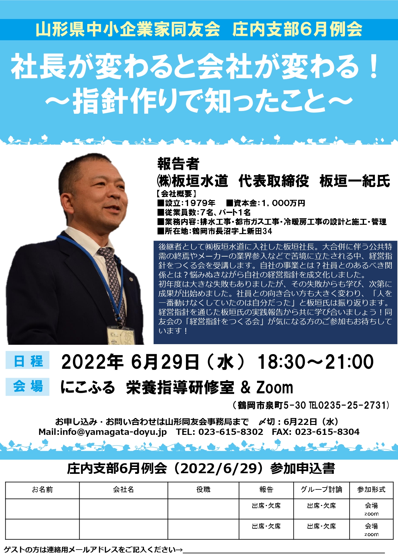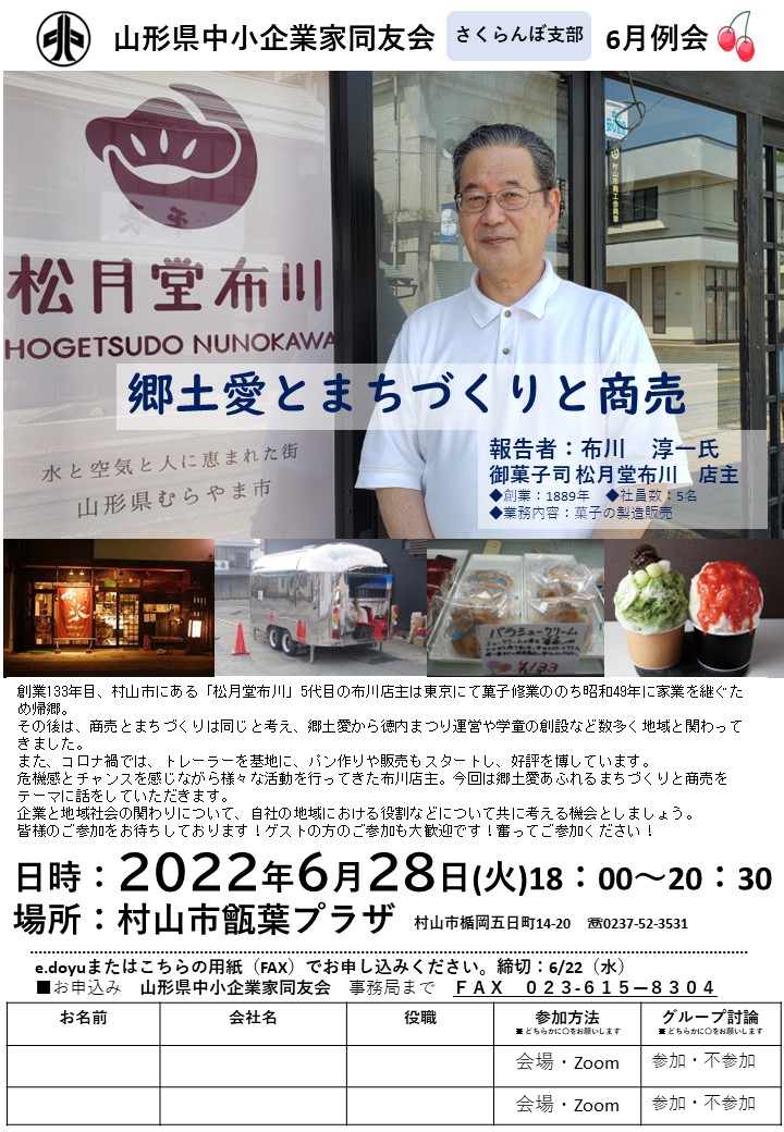 さくらんぼ支部6月例会のご案内を申し上げます。 日時:2022年6月28日(火) 18:00~20:30 場所:村山市甑葉プラザ(村山市楯岡五日町14-20 ☏0237-52-3531)+zoom参加 テーマ:郷土愛とまちづくりと商売 報告者:御菓子司 松月堂布川 店主 布川 淳一 氏...