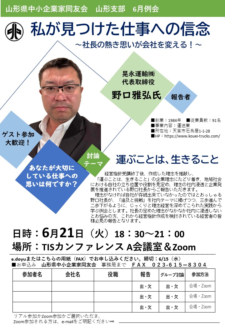 山形支部6月例会のご案内を申し上げます。 日時:6月21日(火)18:30~21:00 会場:TISカンファレンスセンターA会議室&Zoom 報告者:晃永運輸㈱ 代表取締役 野口雅弘氏 テーマ:私が見つけた仕事への信念~社長の熱き思いが会社を変える!~ 経営...