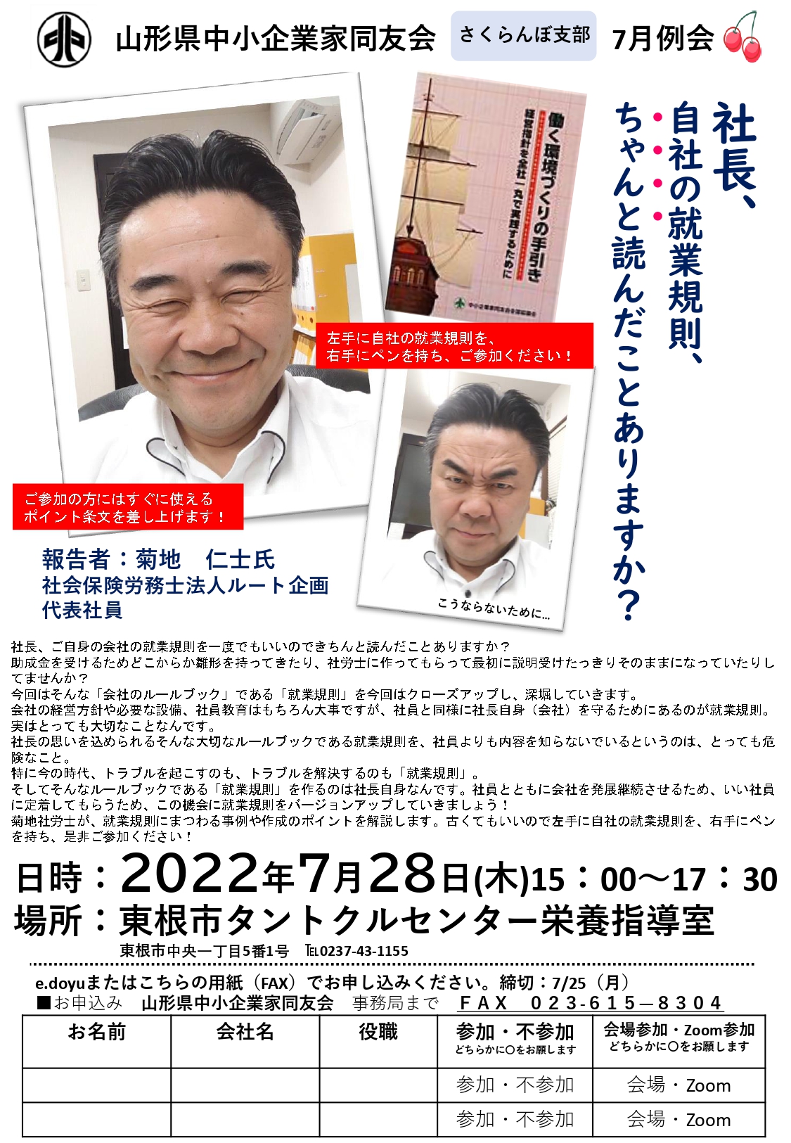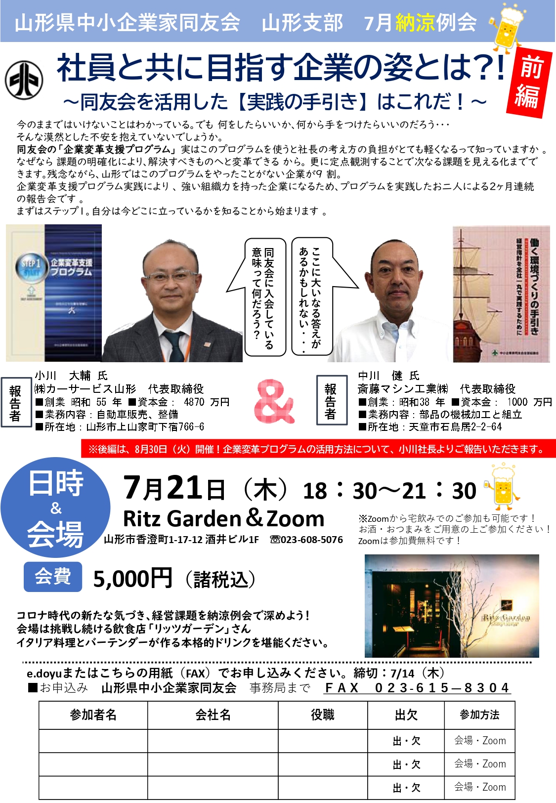 社員と共に目指す企業の姿とは?! ~同友会を活用した【実践の手引き】はこれだ!~【前編】 日時:7月21日(木)18:30~21:30 会場:Ritz Garden&Zoom(山形市香澄町1-17-12 酒井ビル1F) 報告者:㈱カーサービス山形 代表取締役 小川大輔氏 斎藤マシン工業...