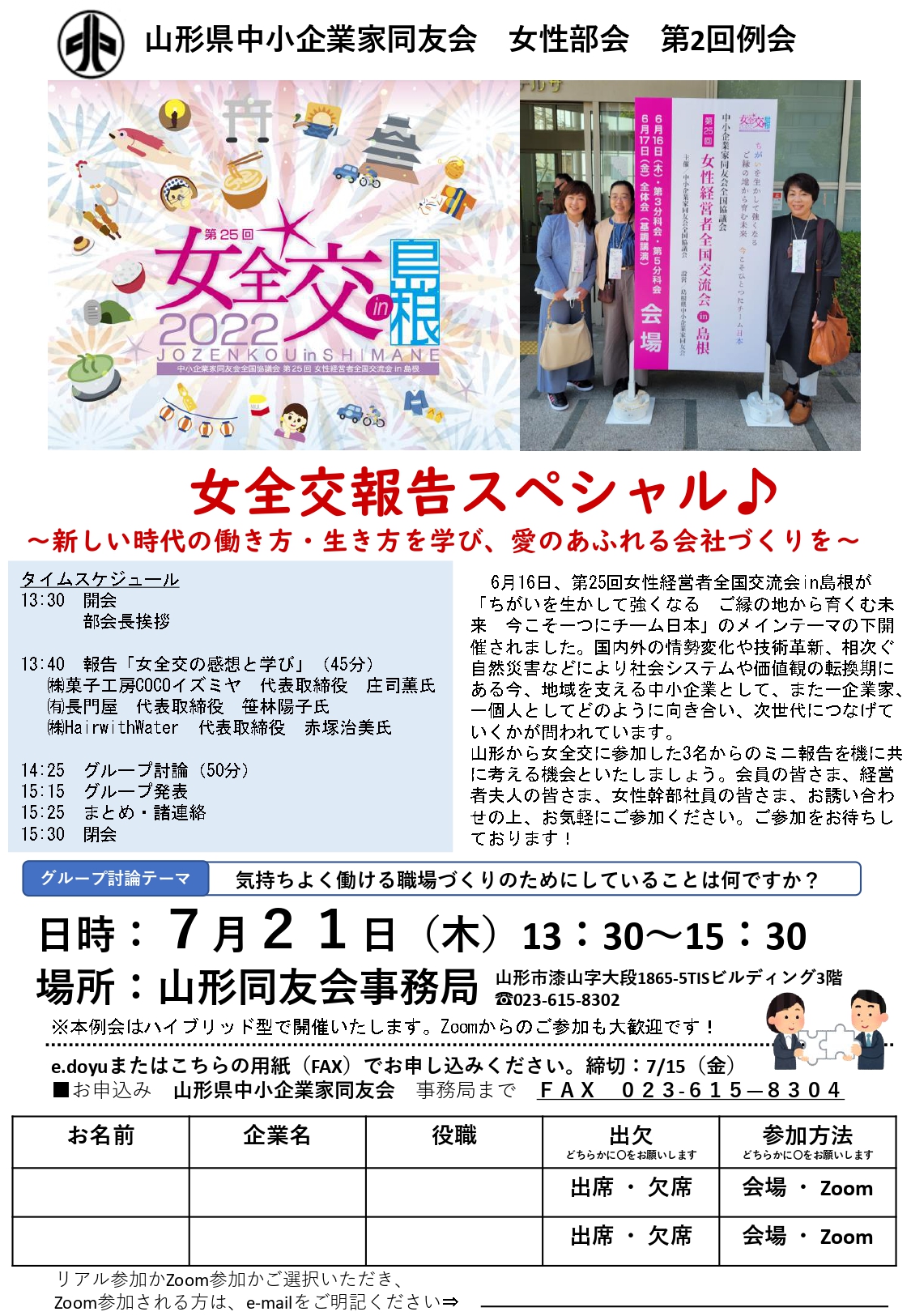 女全交報告スペシャル! ~新しい時代の働き方・生き方を学び、愛のあふれる会社づくりを~ 日時:7月21日(木)13:30~15:30 会場:山形同友会事務局 6月16日、第25回女性経営者全国交流会in島根が「ちがいを生かして強くなる ご縁の地から育くむ未来 今こそ一つに...