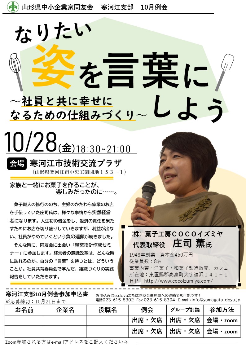 寒河江支部10月例会のご案内を申し上げます。 日時:10月28日(金) 18:30~21:00 会場:寒河江市技術交流プラザ(山形県寒河江市中央工業団地153−1) テーマ:なりたい姿を言葉にしよう~社員と共に幸せになるための仕組みづくり~ 報告者:(株)菓子工房COCOイズミヤ 代表取締役 庄司...