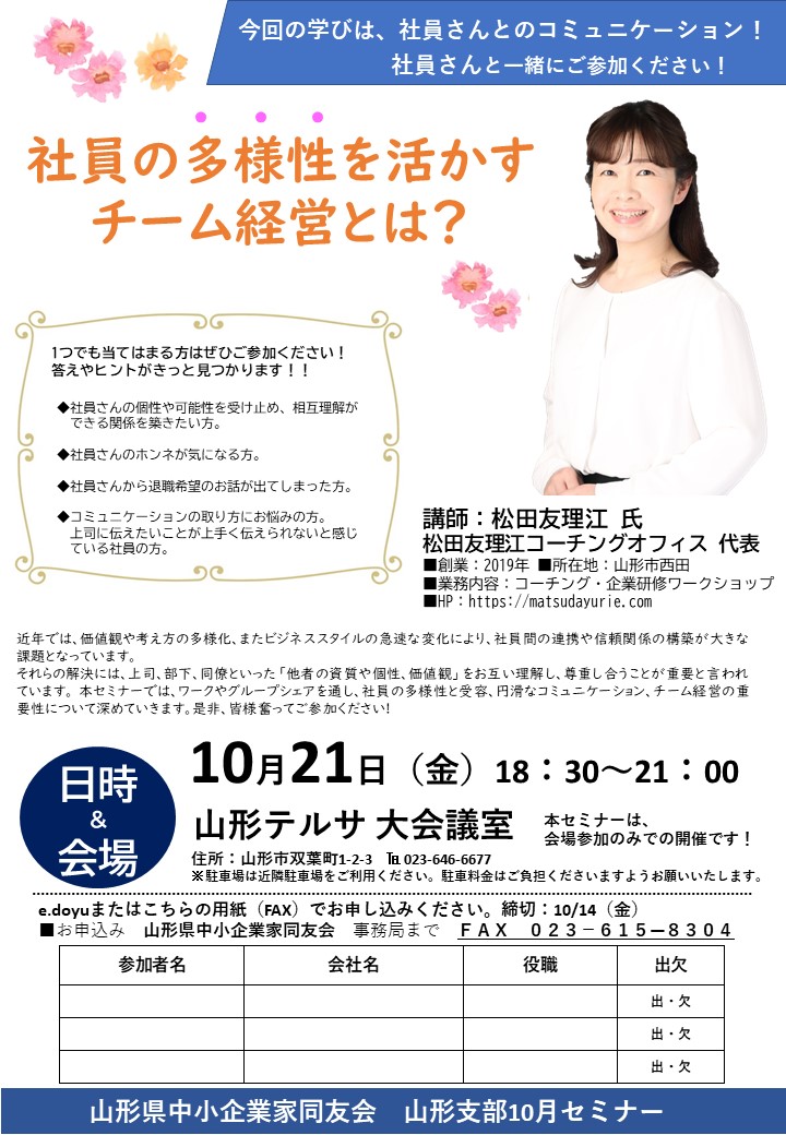 山形支部10月セミナーのご案内を申し上げます。 テーマ:社員の多様性を活かすチーム経営とは? 講師:松田友理江 氏 松田友理江コーチングオフィス 代表 日時:10月21日(金)18:30~21:00 会場:山形テルサ 大会議室 近年では、価値観や考え方の多様化、またビジネ...
