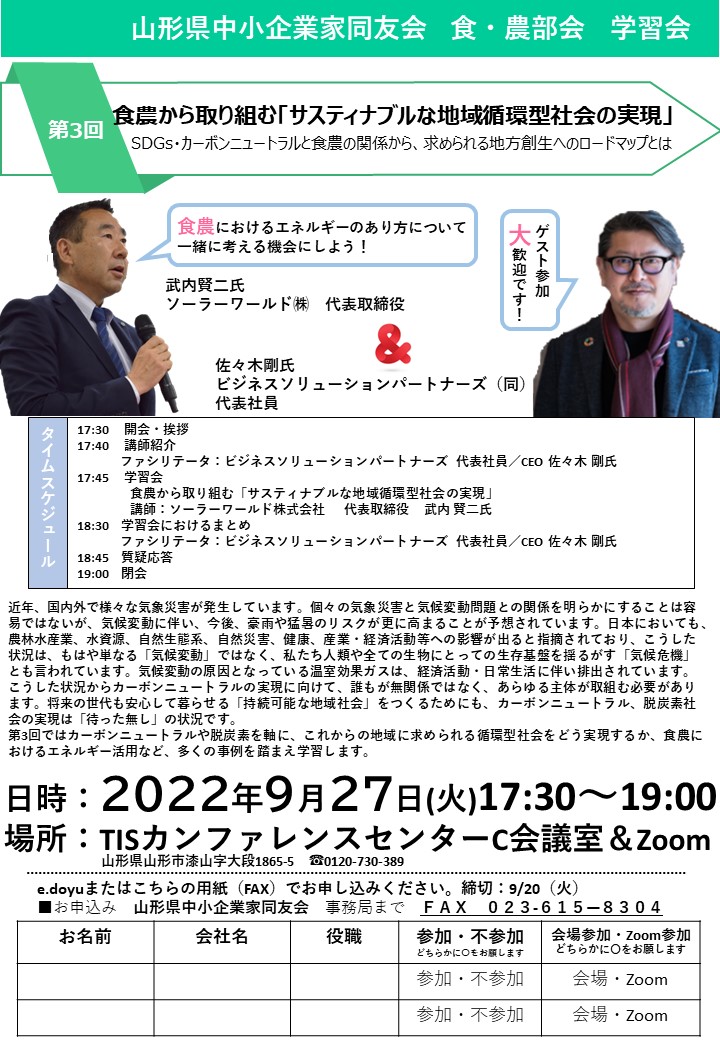 テーマ:食農から取り組む「サスティナブルな地域循環型社会の実現」 ~ SDGs・カーボンニュートラルと食農の関係から、求められる地方創生へのロードマップとは~ ファシリテータ:ビジネスソリューションパートナーズ 代表社員/CEO 佐々木 剛氏 講師:ソーラーワールド株式会...