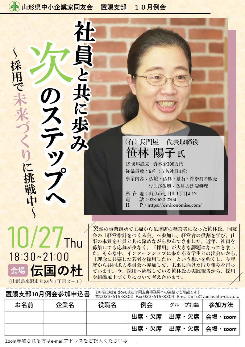 置賜支部10月例会のご案内を申し上げます。 日時:10月27日(木) 18:30~21:00 会場:伝国の杜(山形県米沢市丸の内1丁目2−1) 報告者:(有)長門屋 代表取締役 笹林 陽子氏 テーマ:社員と共に歩み次のステップへ~採用で未来づくりに挑戦中~ 突然の事業継承で主婦から仏壇...
