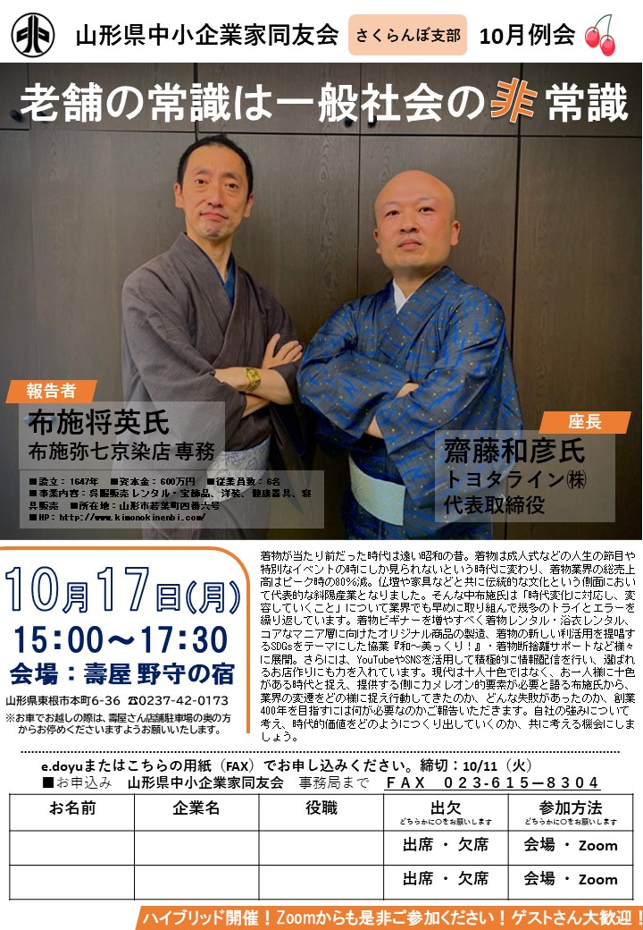 さくらんぼ支部10月例会のご案内を申し上げます。 報告者:㈲布施弥七京染店 専務 布施将英氏 テーマ:老舗の常識は一般社会の非常識 日時:10月17日(月)15:00~17:30 会場:壽屋 野守の宿(山形県東根市本町6-36 ☎0237-42-0173) 着物が当たり前...
