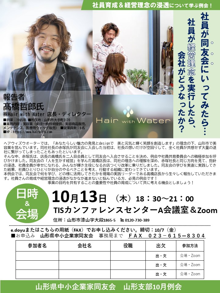 山形支部10月例会のご案内を申し上げます。 テーマ:社員が同友会にいってみたら…社員が経営理念を実行したら会社がどうなったか? 日時:10月13日(木)18:30~21:00 会場:TISカンファレンスセンターA会議室&Zoom 報告者:㈱Hair with Water 店長・ディレク...