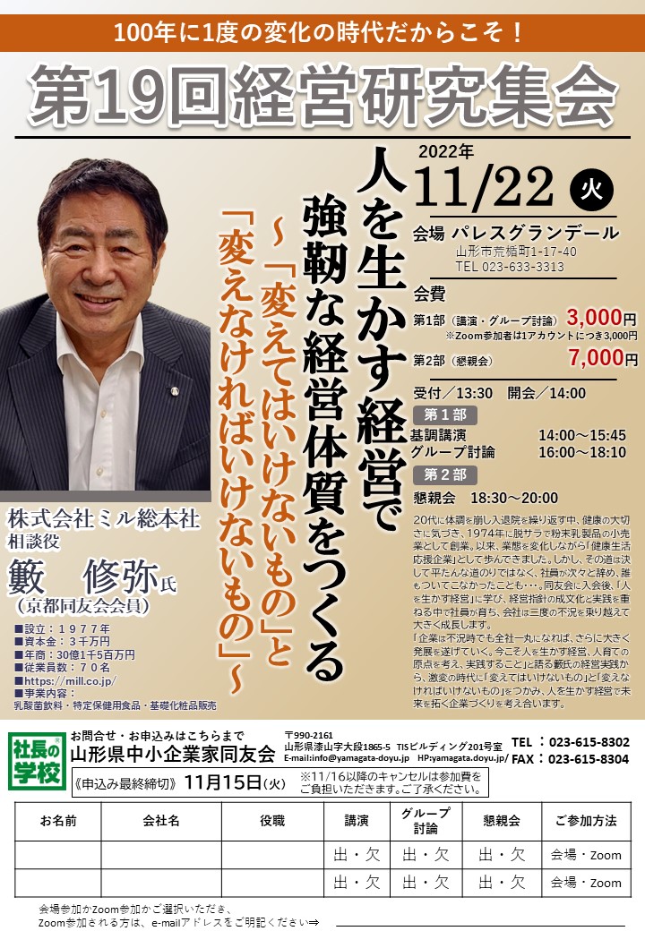 第19回経営研究集会のご案内を申し上げます。 テーマ:人を生かす経営で強靭な経営体質をつくる~変えてはいけないもの」と「かえなければいけないもの」 講師:㈱ミル総本社 相談役 籔修弥氏(京都同友会会員) 日時:2022年11月22日(火) 会場:パレスグランデール&Zoom 山形市荒楯...
