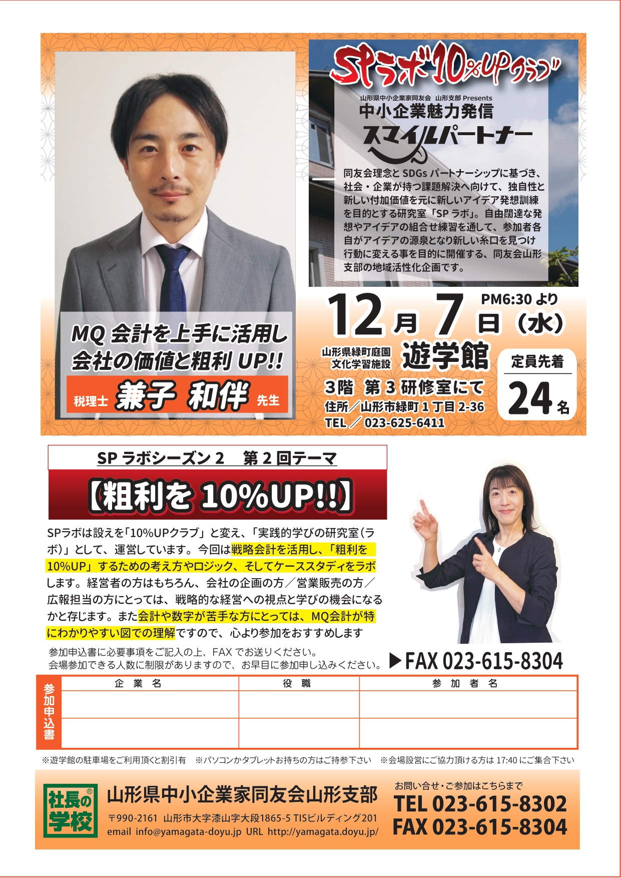SPラボ シーズン2 第2回のご案内を申し上げます。 第2回のテーマは『粗利を10%UP!』です。 MQ会計を上手く活用し、会社の価値と利益をアップさせるための考え方やロジック、ケーススタディを学びます。 日時:12月7日(水)18:30~20:30 会場:遊学館第3研修...