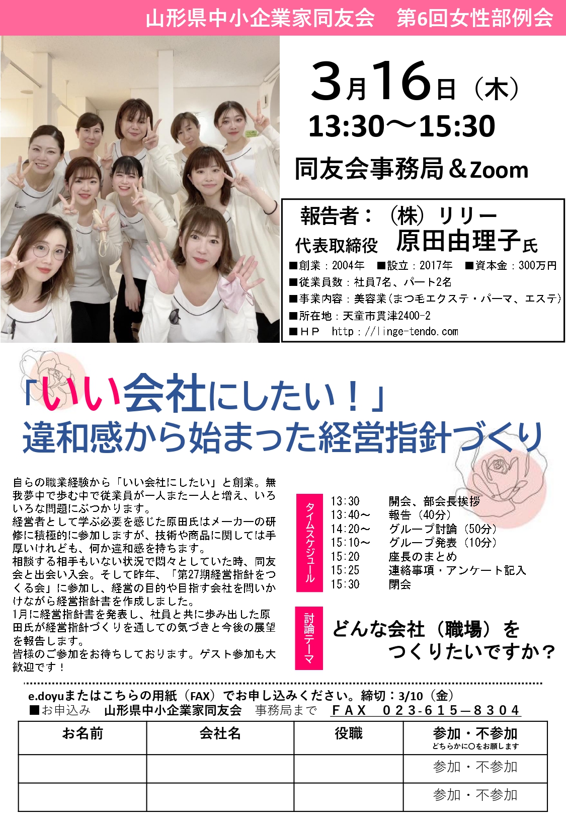 第6回女性部例会のご案内を申し上げます。 テーマ:「いい会社にしたい!」違和感から始まった経営指針づくり 報告者:㈱リリー 代表取締役 原田由理子氏 日 時:2023年3月16日(木)13:30~15:30 会 場:山形同友会事務局&Zoom 自らの職業経験から「いい会社...
