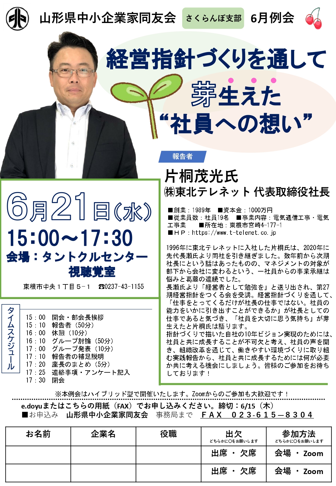 さくらんぼ支部6月例会のご案内を申し上げます。 経営指針づくりを通して芽生えた゛社員への想い” 日時:2023年6月21日(水)15:00~17:30 会場:東根市タントクルセンター視聴覚室&Zoom 報告者:㈱東北テレネット 代表取締役社長 片桐茂光氏 1...