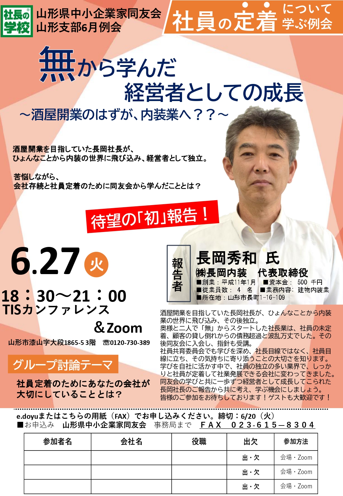 山形支部6月例会のご案内を申し上げます。 日時:6月27日(火)18時30分~21時 会場:TISカンファレンスセンターA会議室 報告テーマ:無から学んだ経営者としての成長~酒屋開業のはずが、内装業へ??~ 報告者:㈱長岡内装 代表取締役 長岡秀和氏 酒屋開業を目指していた長岡社長が、ひょんなことか...