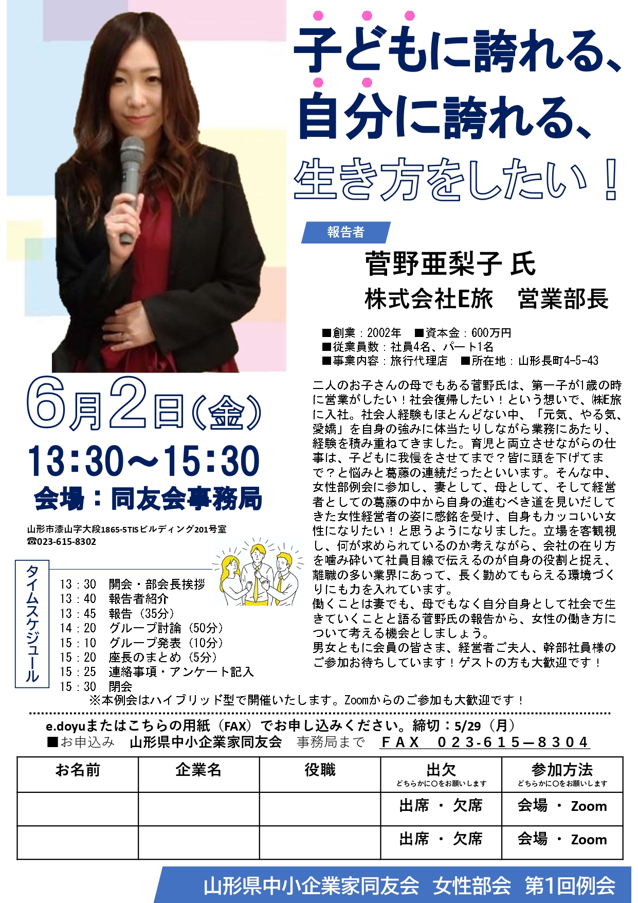 第1回女性部例会のご案内を申し上げます。 日時:2023年6月2日(金)13時30分~15時30分 テーマ:子供に誇れる、自分に誇れる、生き方をしたい! 報告者:㈱E旅 営業部部長 菅野亜梨子氏 会場:同友会事務局&Zoom 二人のお子さんの母でもある菅野氏は、第一子が1歳の時に営業がしたい!社会復...