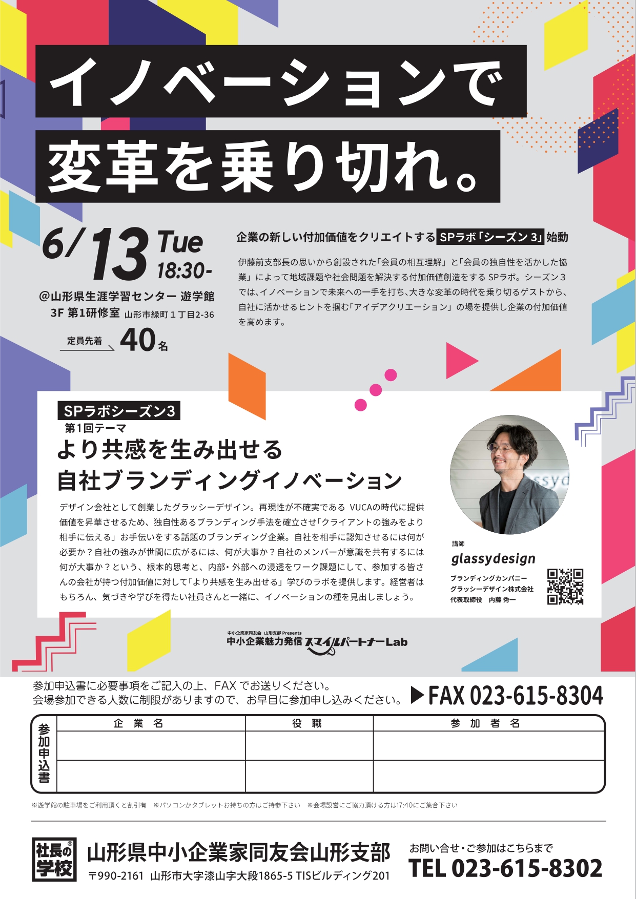 SPラボシーズン3 第1回のご案内を申し上げます。 テーマ:より共感を生み出せる自社ブランディングイノベーション 講師:グラッシーデザイン株式会社 代表取締役 内藤 秀一氏 日時:2023年6月13日(火)18:30~20:30 会場:遊学館 3階 第1研修室 デザイン会...