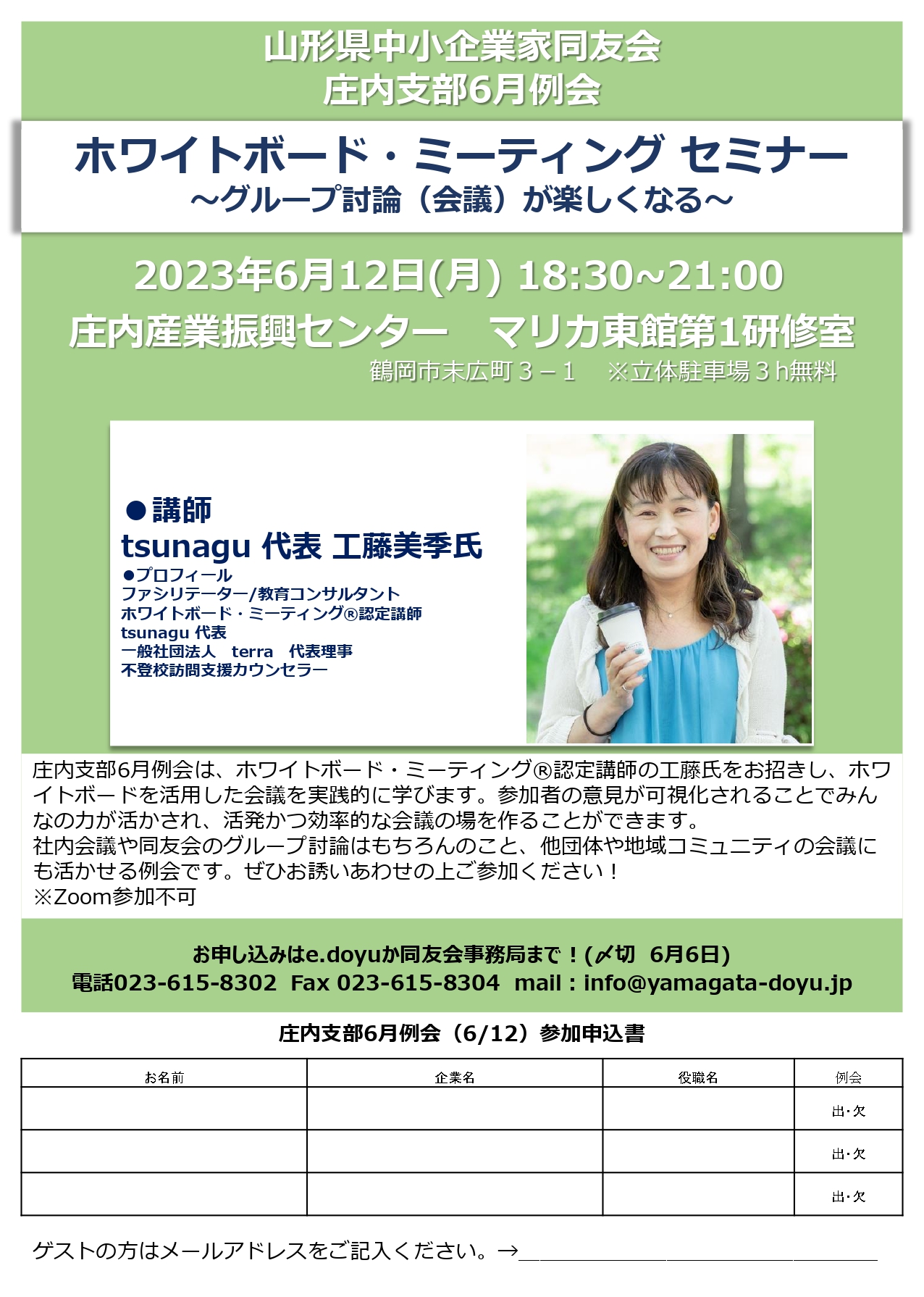 テーマ:ホワイトボード・ミーティング セミナー~グループ討論(会議)が楽しくなる~ 講師:tsunagu 代表 工藤美季氏 会場:庄内産業振興センター マリカ東館第1研修室(鶴岡市末広町3−1) 庄内支部6月例会は、ホワイトボード・ミーティング®認定講師の工藤氏をお招きし、ホワイトボ...