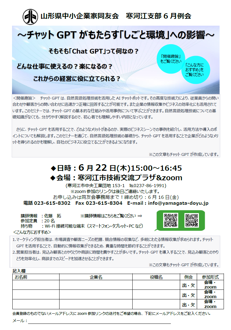 いつもお世話になっております。 寒河江支部6月例会のご案内を申し上げます。 日時:6月22日(木)15:00~16:45 会場:寒河江市技術交流プラザ(寒河江市中央⼯業団地153-1 ℡0237-86-1991) 講師:佐藤 拓氏 テーマ:チャットGPTがもたらす「しごと環境」への影響 <開催趣旨>...