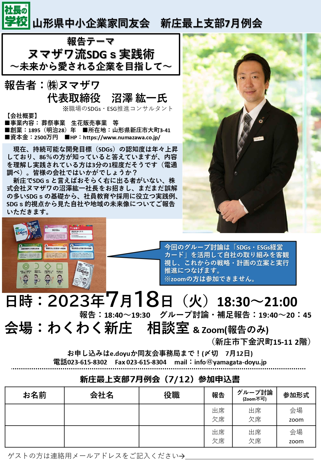 テーマ:ヌマザワ流SDGs実践術~未来から愛される企業を目指して~ 報告者:㈱ヌマザワ 代表取締役 沼澤 紘一氏 日 時:2023/07/18 (火) 18:30~21:00 会 場:わくわく新庄 相談室(新庄市下金沢町15-11) 現在、持続可能な開発目標(SDGs)の認知度は年々...
