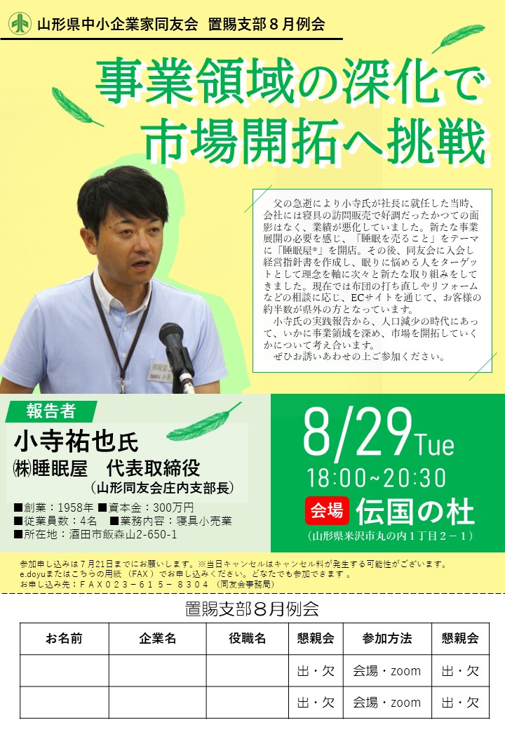 置賜支部8月例会のご案内を申し上げます。 テーマ:事業領域の深化で市場開拓へ挑戦 日時:8月29日(火) 18:00~20:30 会場:伝国の杜(山形県米沢市丸の内1丁目2−1) 報告者:㈱睡眠屋 代表取締役 小寺祐也氏(山形同友会庄内支部長) 父の急逝により小寺氏が社長に就任した当時、会社には寝具...