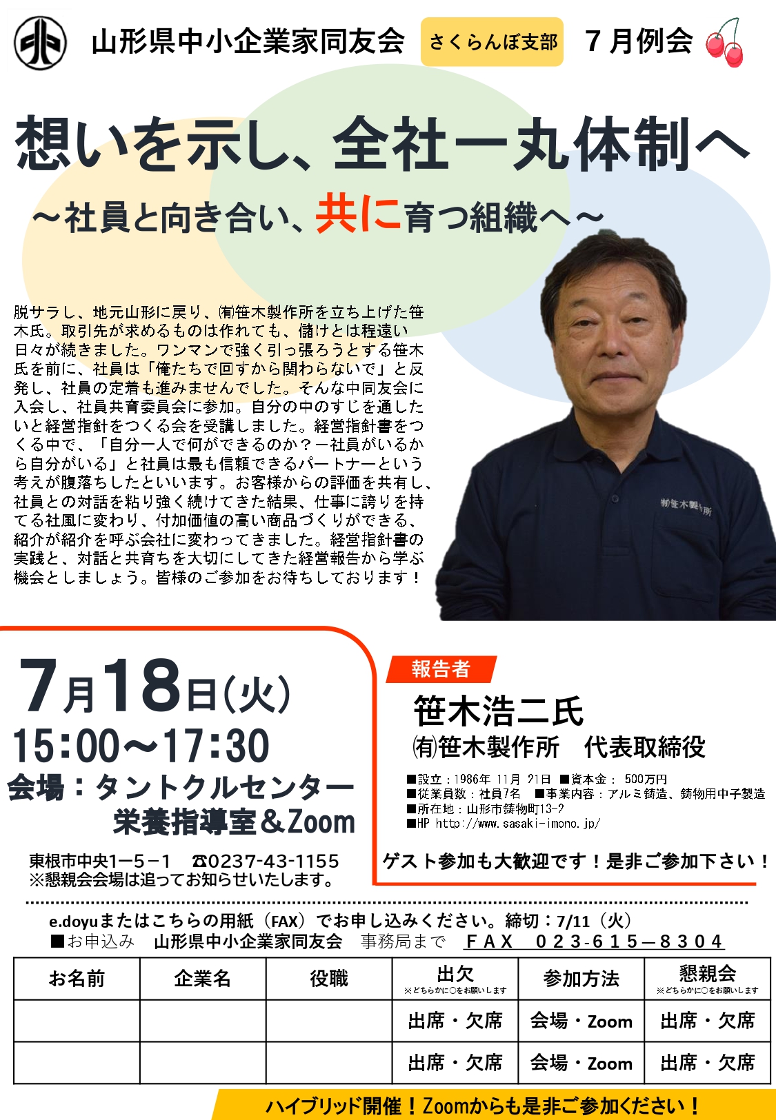 さくらんぼ支部7月例会のご案内を申し上げます。 想いを示し、全社一丸体制へ~社員と向き合い、共に育つ組織へ 日時:7月18日(火)15:00~17:30 会場:タントクルセンター栄養指導室&Zoom 報告者:㈲笹木製作所 代表取締役 笹木浩二氏 脱サラし、地...