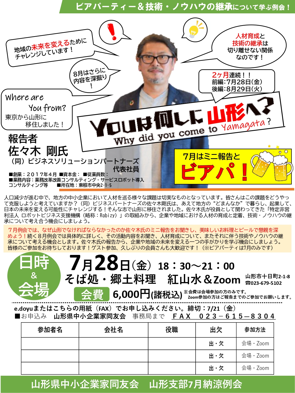 山形支部7月例会のご案内です。 7月例会は、8月例会と2か月連続の企画となります。 前編となる7月例会はビアパーティメインで、報告者の合同会社ビジネスソリューションパートナーズの佐々木氏よりミニ報告をいただきます。 Youは何しに山形へ? 日時:7月28日(金)18時30分から21時0...