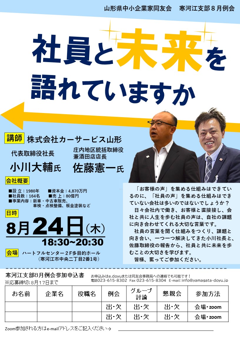 寒河江支部8月例会のご案内を申し上げます。 テーマ:社員と未来を語れていますか 日時:8月24日(木)18:30~20:30 会場:ハートフルセンター2F 多目的ホール(寒河江市中央二丁目2番1号) 講師:㈱カーサービス山形 代表取締役社長 小川大輔氏 庄内地区統括取締役兼酒田店店長 佐藤憲一氏 「...