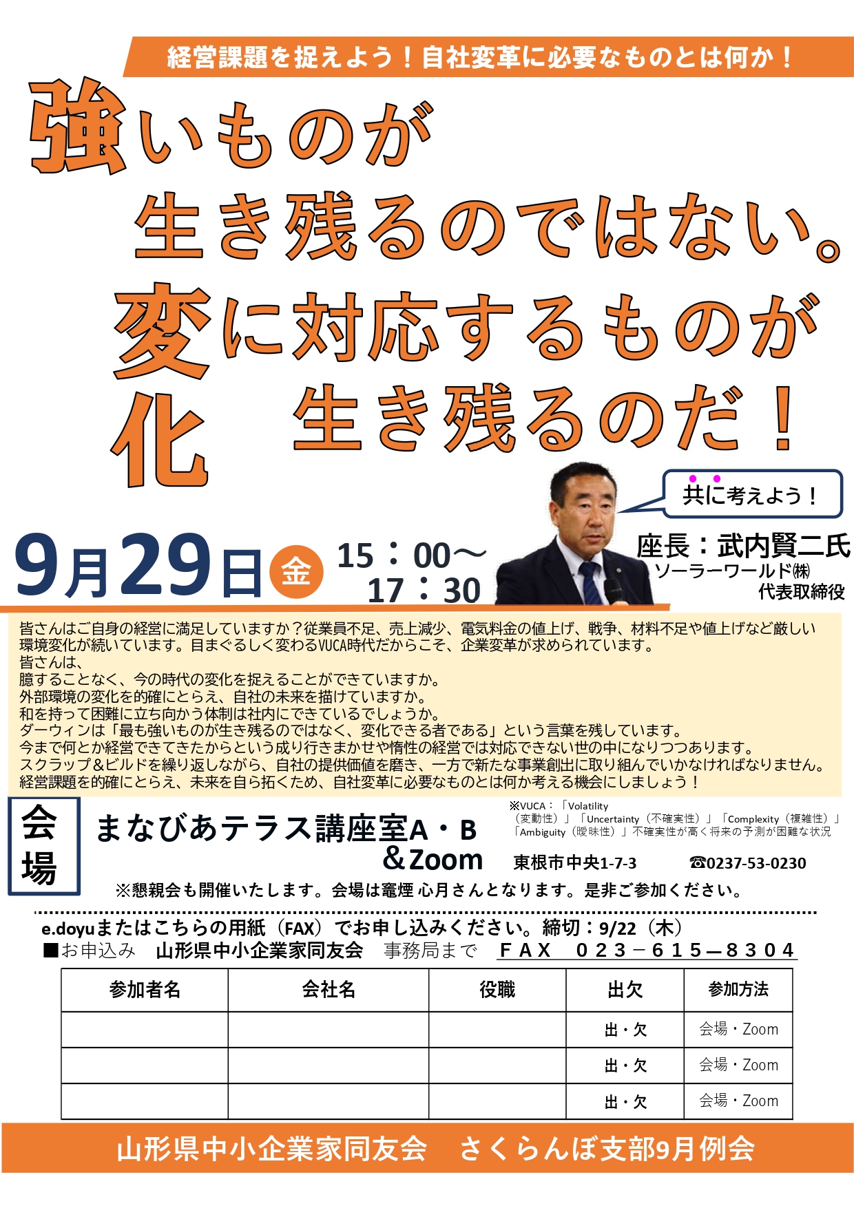 さくらんぼ支部9月例会のご案内を申し上げます。 テーマ:強いものが生き残るのではない。変化に対応するものが生き残るのだ! 日 時:9月29日(金)15:00~17:30 会 場:東根市まなびあテラス講座室A・B&Zoom 皆さんはご自身の経営に満足していますか?従業員不足、売上減少、電...