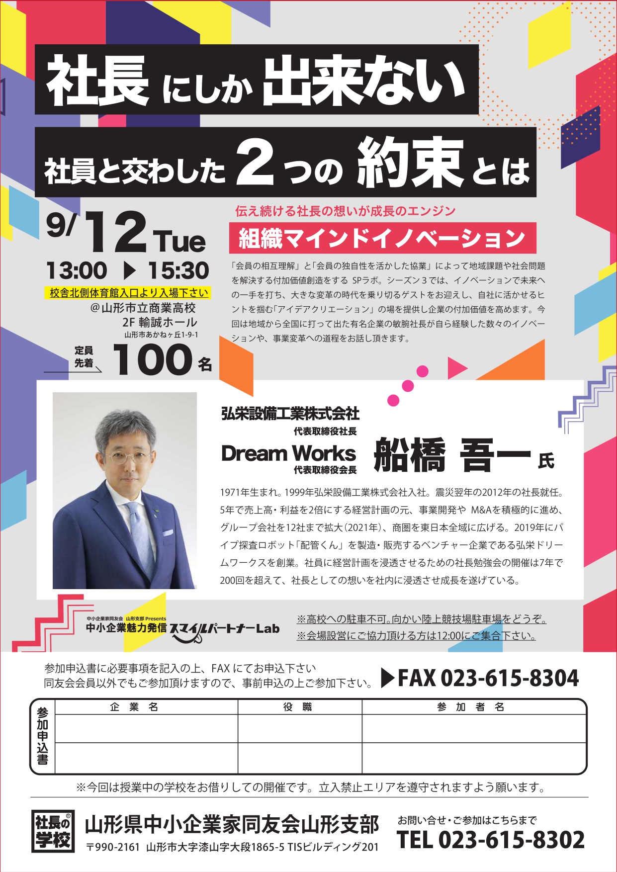 SPラボシーズン3 第2回のご案内を申し上げます。 タイトル:社長にしかできない社員と交わした2つの約束とは 伝え続ける社長の想いが成長のエンジン 講師:弘栄設備工業株式会社 船橋吾一氏 日時:2023年9月12日(火)13:00~15:30 会場:山形市立商業高校 輸誠ホール &nb...
