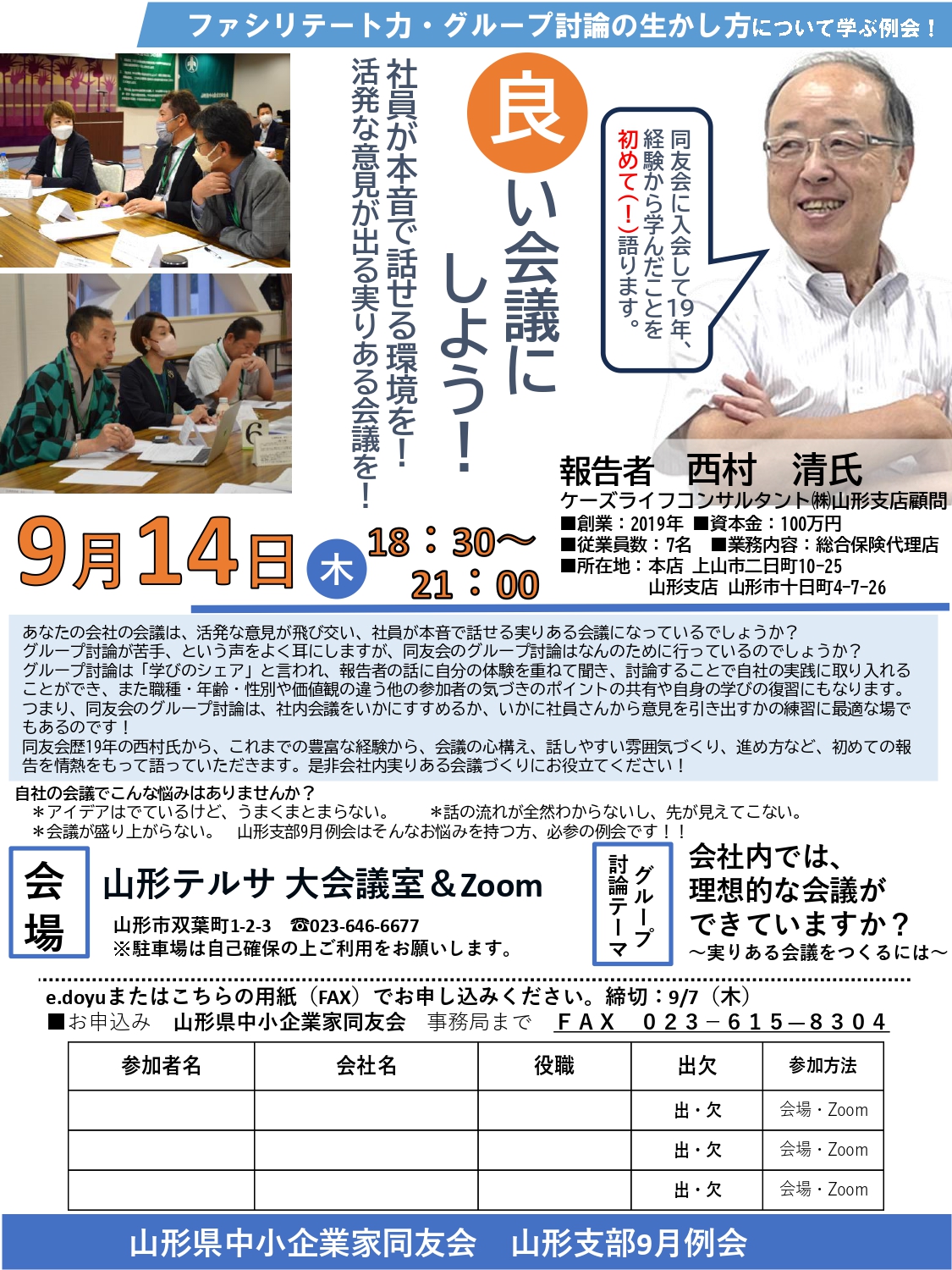 山形支部9月例会のご案内を申し上げます。 テーマ:良い会議にしよう! ~社員が本音で話せる環境を!活発な意見がでる実りある例会を!~ 報告者:ケーズライフコンサルタント㈱ 山形支店 顧問 西村清氏 日時:9月14日(木)18:30~21:00 会場:山形テルサ 大会議室&Zoom 本例...