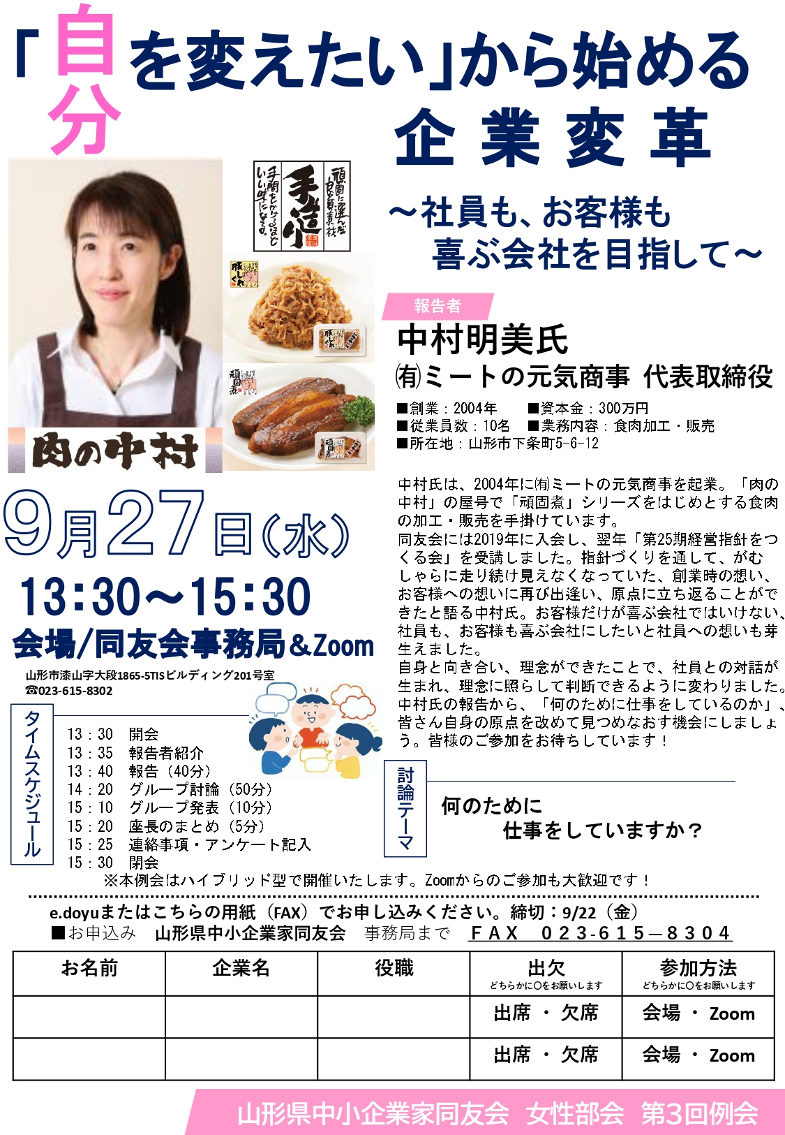 第3回女性部例会のご案内を申し上げます。 テーマ:「自分を変えたい」から始める企業変革~社員も、お客様も喜ぶ会社を目指して~ 報告者:㈲ミートの元気商事 代表取締役 中村明美氏 日 時:9月27日(水)13:30~15:30 中村氏は、2004年に㈲ミートの元気商事を起業...