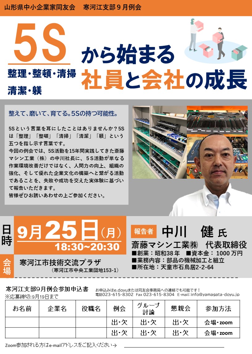 寒河江支部9月例会のご案内を申し上げます。 日時:9月25日(月)18:30~20:30 会場:寒河江市技術交流プラザ(寒河江市中央工業団地153-1) 講師:斎藤マシン工業㈱ 代表取締役 中川健 氏 テーマ:5Sから始まる社員と会社の成長 5Sという言葉を耳にしたことはありませんか?5Sは「整理」...