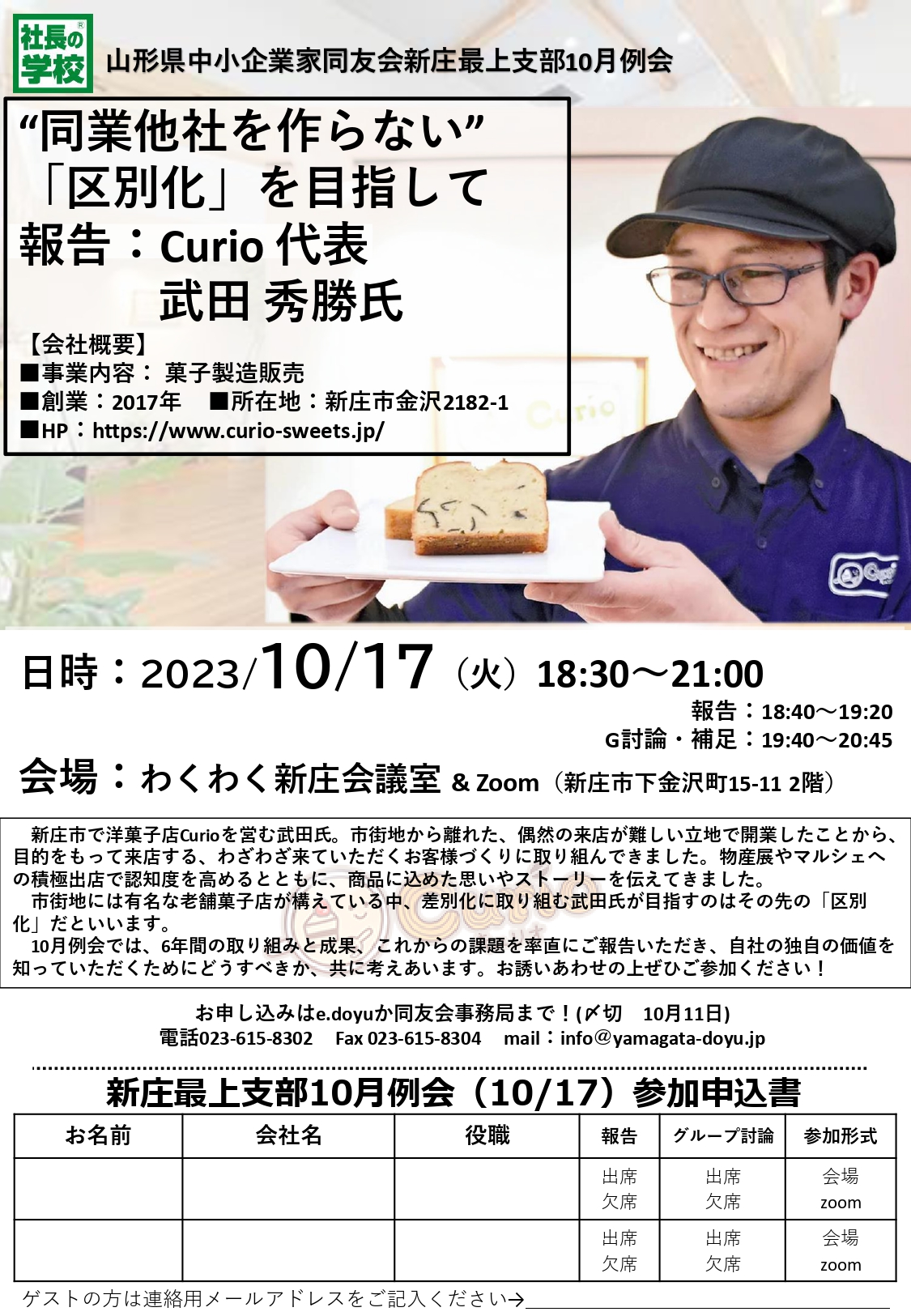2023.10.05 新庄最上支部10月例会 10月例会は新庄最上支部新会員の武田氏のご報告です! テーマ:“同業他社を作らない”「区別化」を目指して 報告者:Curio 代表 武田 秀勝氏 会 場:わくわく新庄 会議室(新庄市下金沢町15-11) 新庄市で洋菓子店Curioを営む武田氏。市街地から離れた、偶然の来店が難しい立地...
