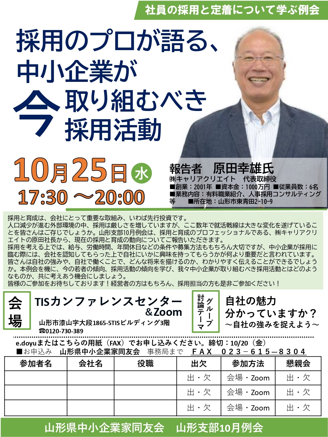 山形支部10月例会のご案内を申し上げます。 採用のプロが語る、中小企業が今取り組むべき採用活動 日時:10月25日(水)17:30~21:00 報告者:㈱キャリアクリエイト 代表取締役 原田幸雄氏 会場:TISカンファレンスセンターA会議室&Zoom 採用と育成は、会社にとって重要な取組み、いわば先...
