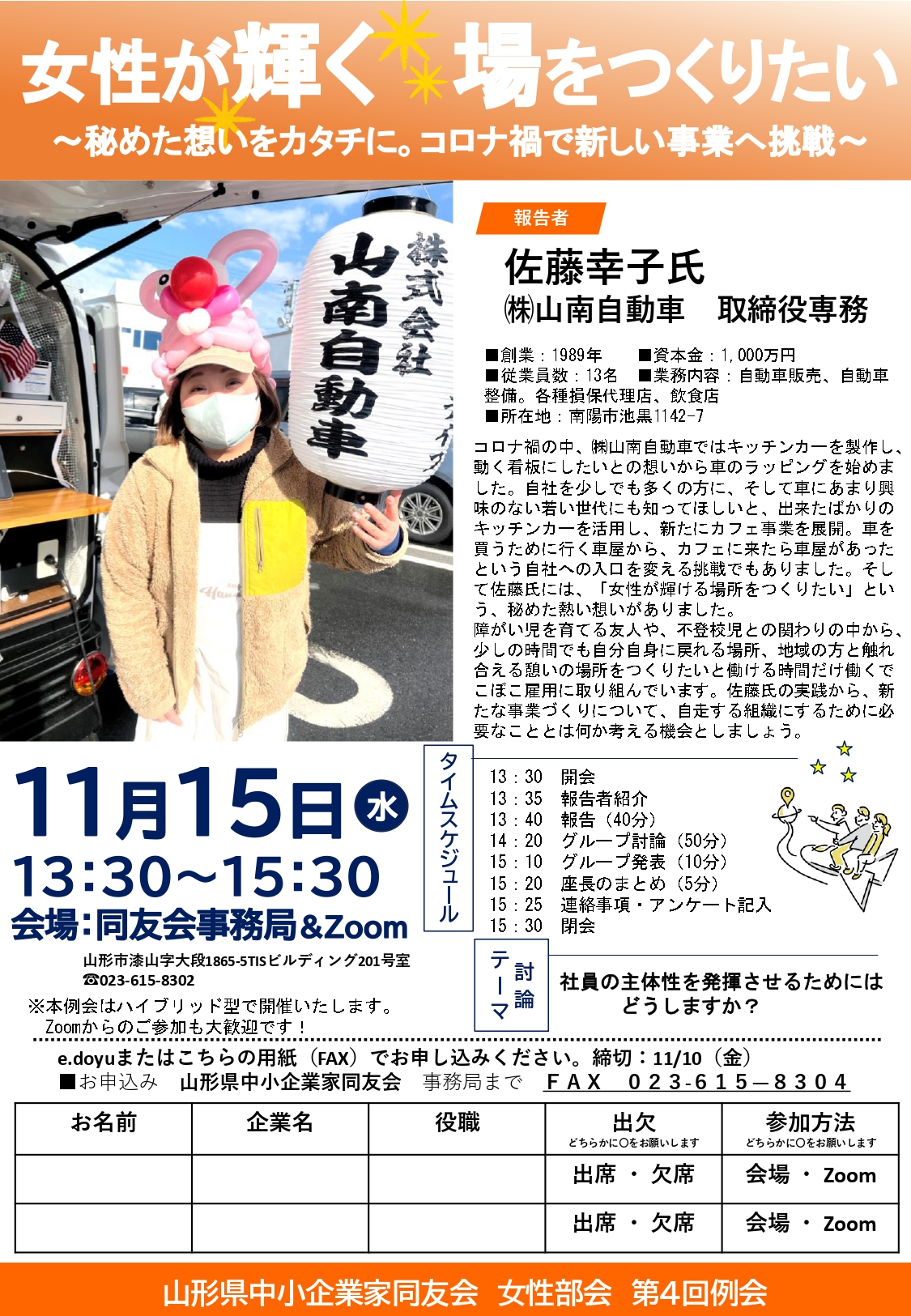第4回女性部例会のご案内を申し上げます。 タイトル:女性が輝く場をつくりたい~秘めた想いをカタチに。コロナ禍で新しい事業へ挑戦~ 報告者:㈱山南自動車 取締役専務 佐藤幸子氏 日時:2023年11月15日(水)13:30~15:30 会場:同友会事務局&Zoom コロナ禍の中、㈱山南自...