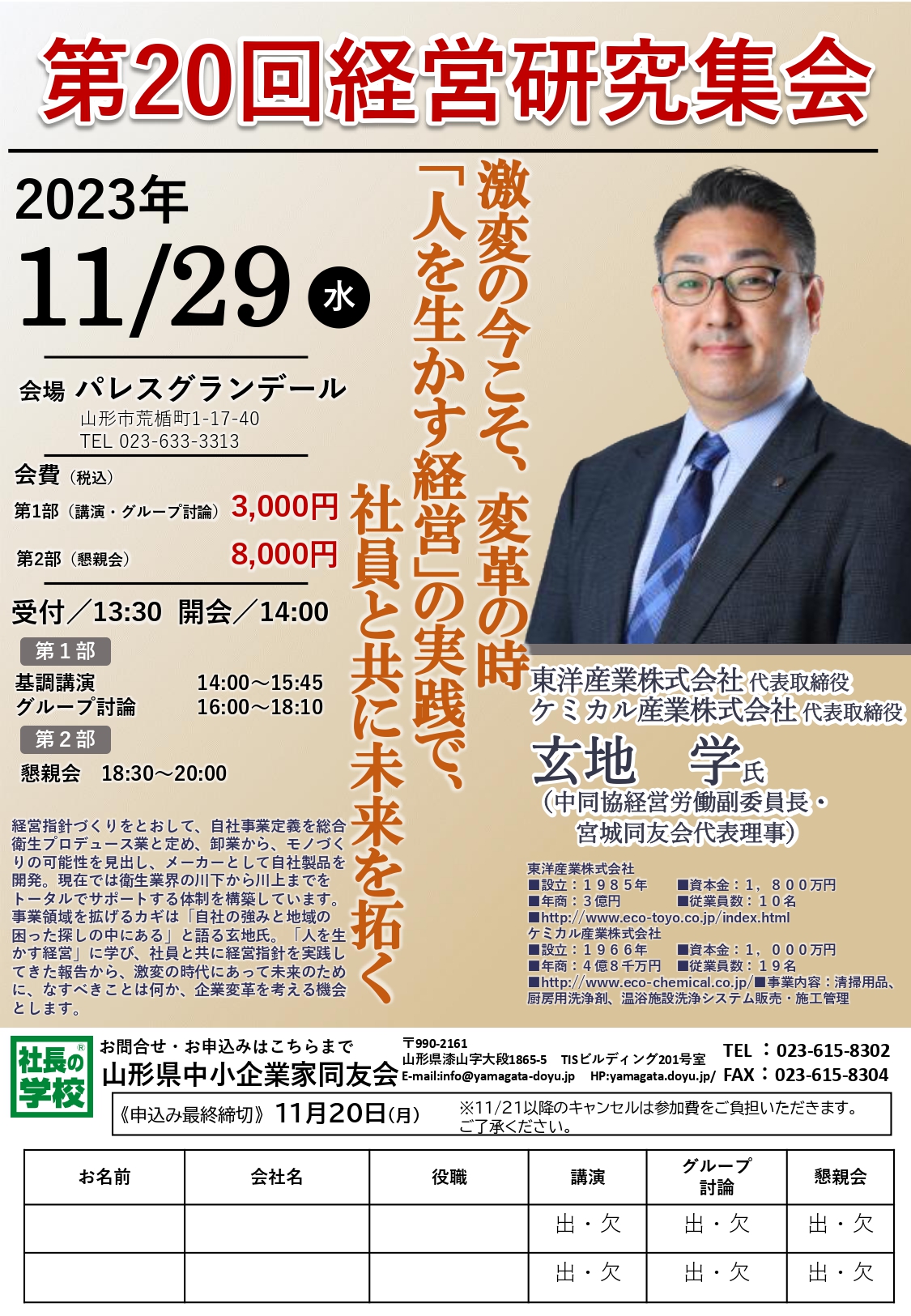 第20回経営研究集会のご案内を申し上げます。 日時:2023年11月29日(水) 会場:パレスグランデール 基調講演:激変の今こそ、変革の時 「人を生かす経営」の実践で、社員と共に未来を拓く 東洋産業㈱ 代表取締役・ケミカル産業㈱ 代表取締役 玄地学氏(中同協経営絵労働副委員長・宮城同...