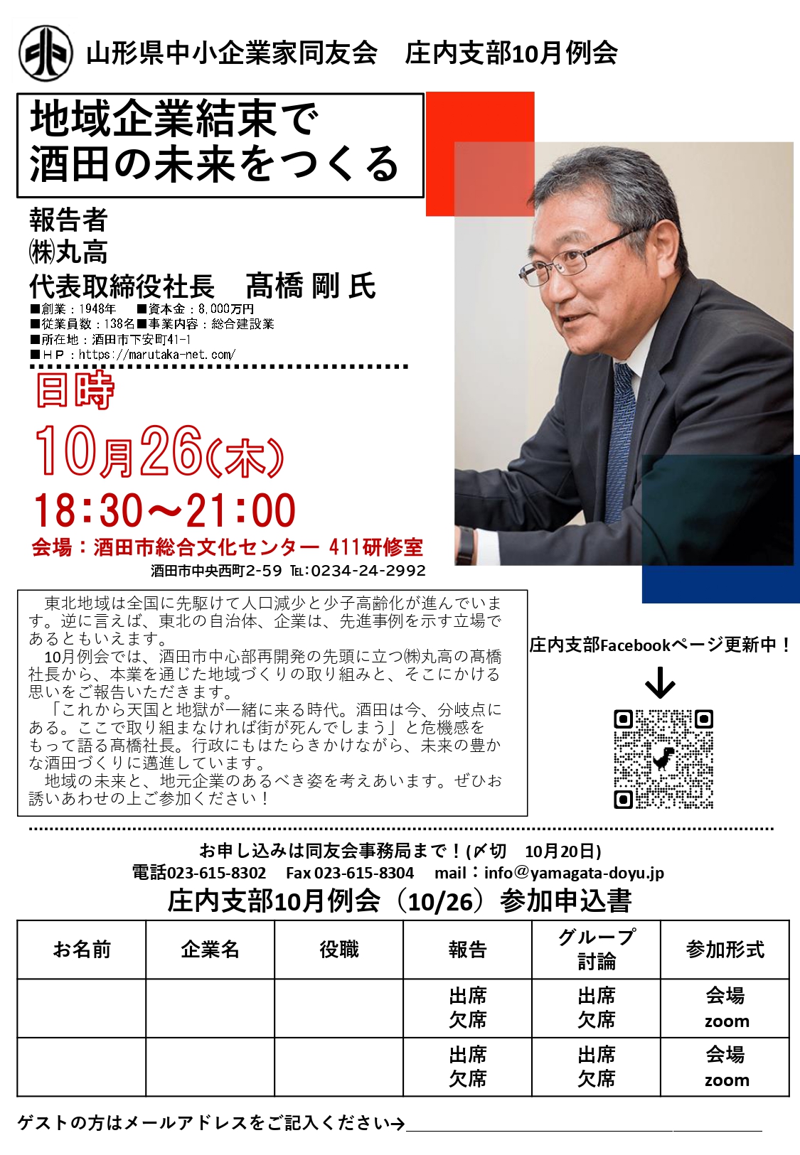 テーマ:地域企業結束で酒田の未来をつくる 報告者:㈱丸高 代表取締役社長 髙橋 剛 氏 会 場:酒田市中央公民館411研修室(酒田市中央西町2-59) 東北地域は全国に先駆けて人口減少と少子高齢化が進んでいます。逆に言えば、東北の自治体、企業は、先進事例を示す立場であるともいえます。 10月例会では...