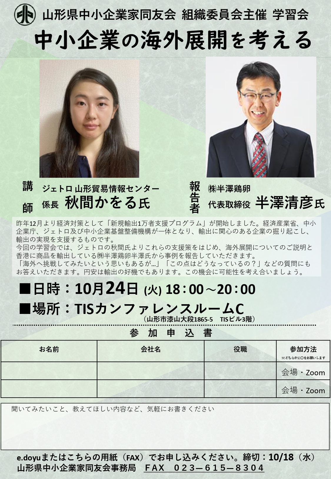 組織委員会主催の学習会のご案内を申し上げます。 テーマ:中小企業の海外展開を考える 日時:2023年10月24日(火)18:00~20:00 会場:TISカンファレンスセンターC会議室&Zoom 講師:ジェトロ山形貿易情報センター 係長 秋間かをる氏 報告者:㈱半澤鶏卵 代表取締役 半...