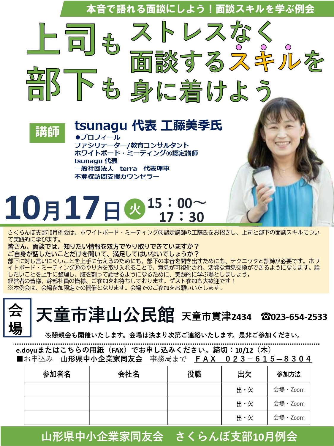さくらんぼ支部10月例会のご案内を申し上げます。 テーマ:上司も部下もストレスなく面談するスキルを身に着けよう 講師:tsunagu 代表 工藤美季氏 日時:2023年10月17日(火)15:00~17:30 会場天童市津山公民館(天童市貫津2434 ☎023-654-2533) さくらんぼ支部10...