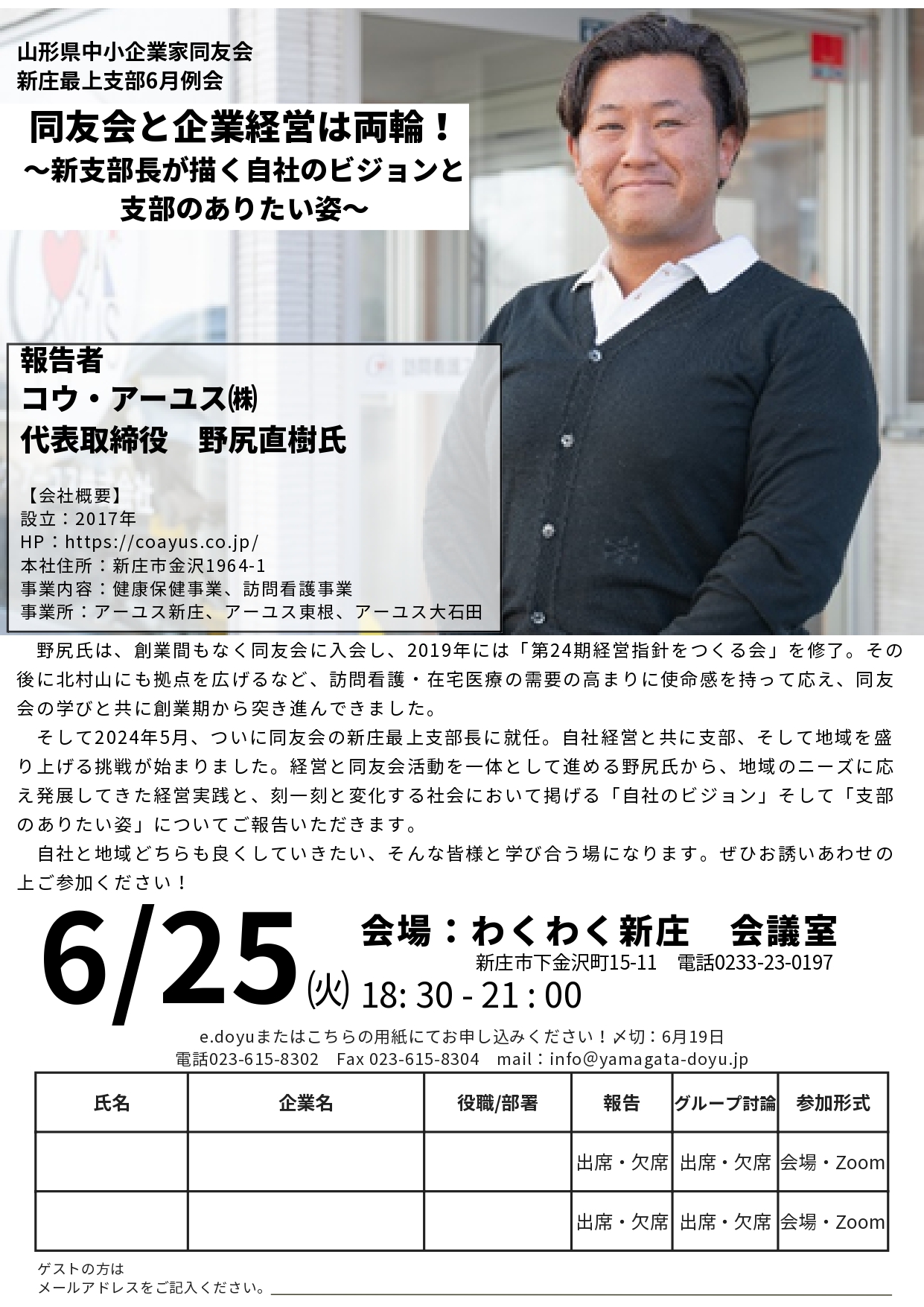 6月例会は新庄最上支部新支部長の野尻氏のご報告です! テーマ:同友会と企業経営は両輪!~新支部長が描く自社のビジョンと支部のありたい姿~ 報告者:コウ・アーユス㈱ 代表取締役 野尻直樹氏 野尻氏は、創業間もなく同友会に入会し、2019年には「第24期経営指針をつくる会」を修了。その後に北村山にも拠点...