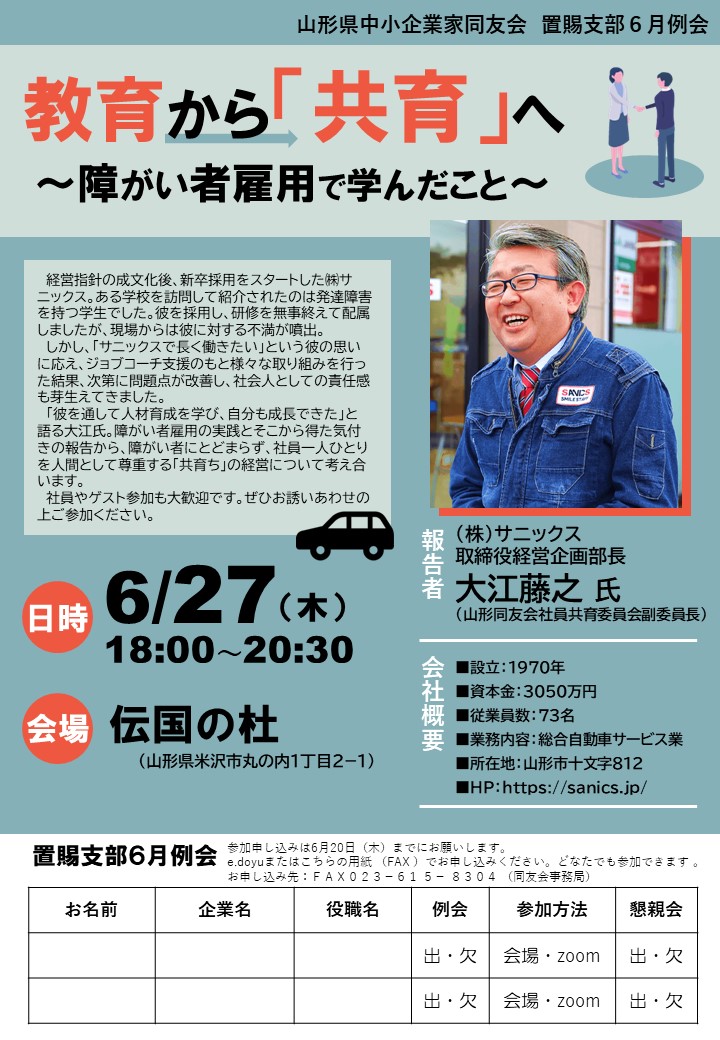 日時:6月27日(木) 18:00~20:30 会場:伝国の杜(山形県米沢市丸の内1丁目2−1) 報告者:(株)サニックス 取締役経営企画部長 大江藤之 氏(山形同友会社員共育委員会副委員長) テーマ:教育から「共育」へ ~障がい者雇用で学んだこと~ 経営指針の成文化後、...