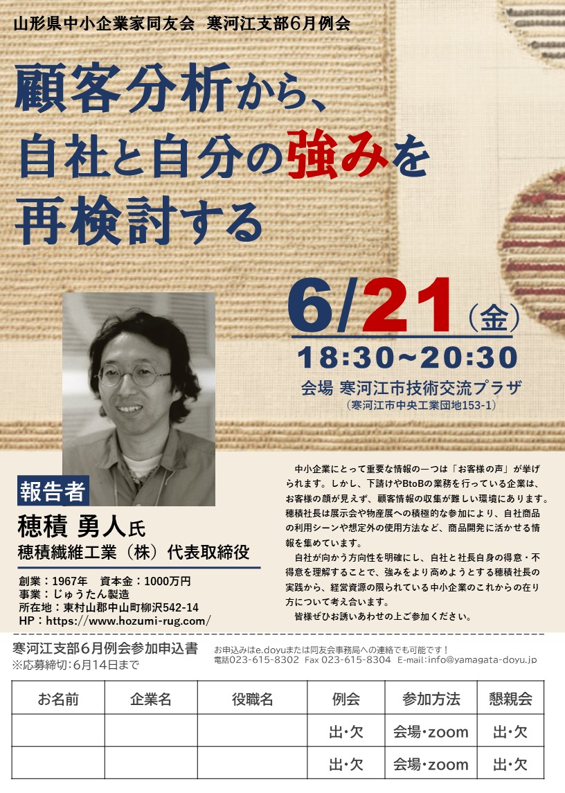 日時:6月21日(金)18:30~20:30 会場:寒河江市技術交流プラザ(寒河江市中央工業団地153-1) 講師:穂積繊維工業(株)代表取締役 穂積 勇人氏 テーマ:顧客分析から、自社と自分の強みを再検討する 中小企業にとって重要な情報の一つは「お客様の声」が挙げられます。しかし、下...