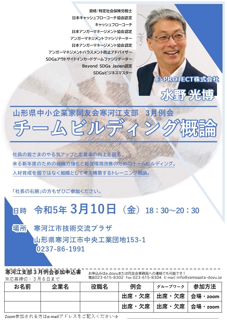 寒河江支部3月例会のご案内を申し上げます。 日時:3月10日(金)18:30~20:30 会場:寒河江市技術交流プラザ 講師:E-PROJECT株式会社 水野 光博氏 テーマ:チームビルディング概論 社員の皆さまのやる気アップと定着率の向上を図る、 来る新年度のための組織力強化と経営環境改善のための...