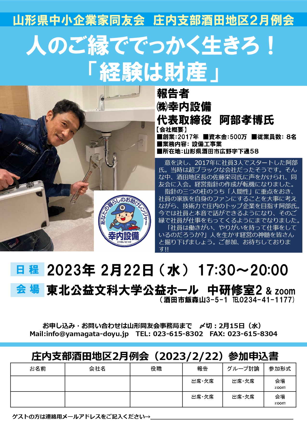庄内支部・酒田地区2月例会のご案内です。 テーマ:人のご縁ででっかく生きろ!「経験は財産」 報告者:㈱幸内設備 代表取締役 阿部孝博氏 日時:2023/02/22 (水) 17:30~20:00 会場:東北公益文科大学公益ホール2階 中研修室2(酒田市飯...