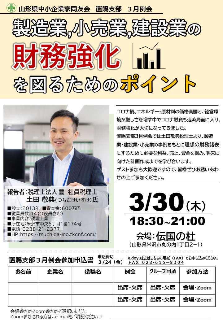 置賜支部3月例会のご案内を申し上げます。 日時:3月30日(木) 18:30~21:00 会場:伝国の杜(山形県米沢市丸の内1丁目2−1) 報告者:税理士法人 豊 社員税理士 土田 敬典(つちだけいすけ)氏 テーマ:製造業、小売業、建設業の財務強化を図るためのポイント コロナ禍、エネル...