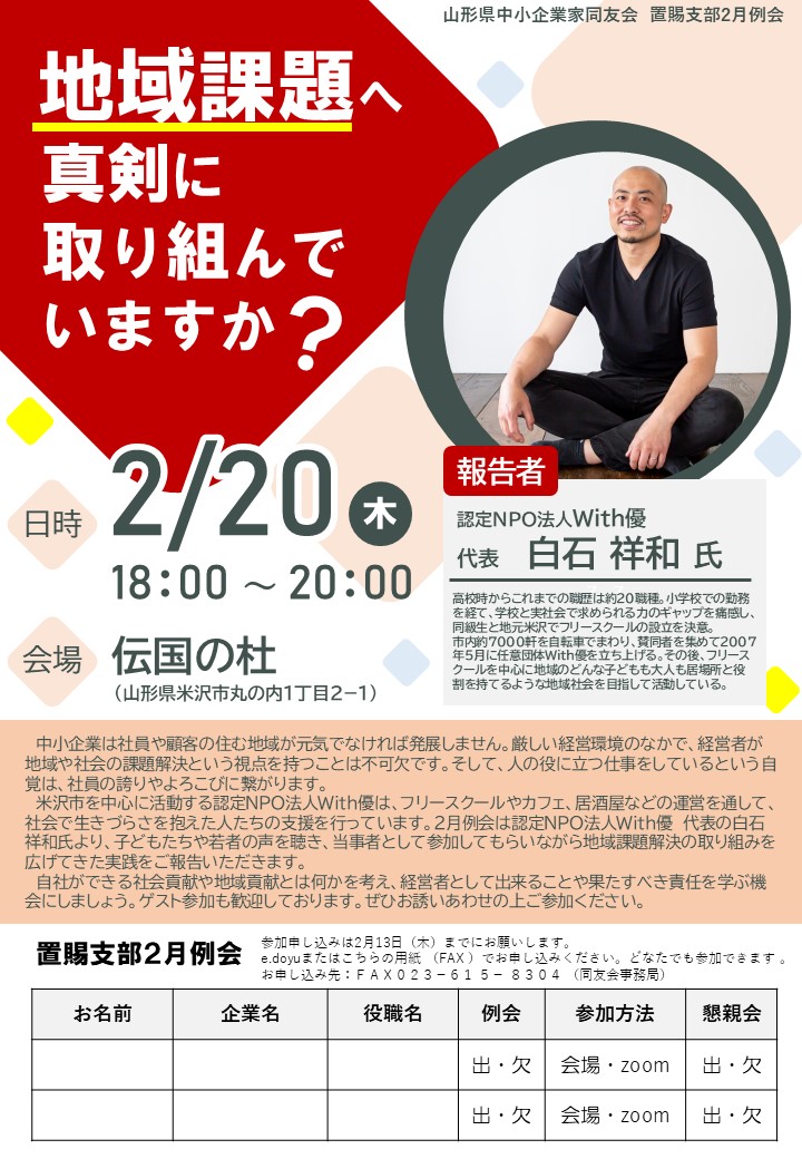 日時:2月20日(木) 18:00~20:00 会場:伝国の杜(山形県米沢市丸の内1丁目2−1) 報告者:認定NPO法人With優 代表 白石 祥和 氏 テーマ:地域課題へ真剣に取り組んでいますか? 中小企業は社員や顧客の住む地域が元気でなければ発展しません。厳しい経営環...