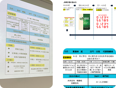 また、企業変革支援プログラムで社員さんに分析もしてもらい、一つ今期取り組む課題テーマを選んでいただき、その内容を自分の強みを使ってどのように課題を解決するのか?+自分は2030年どうなりたい(ビジョン)のか?を記載してもらい、個人シートとして経営指針発表会で発表をしてもらうことで自分が今年一年何をするのか?と会社の進むべき方向性を一致させ、主体性が育める機会を作るようにしています。その集合体が「経営指針書」として、社員さんと進むための最強のツールとなりなくてはならないものになっております。
