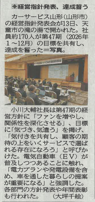 2026年1月14日の山形新聞に㈱カーサービス山形の経営指針発表会が紹介されています。ぜひご覧ください。